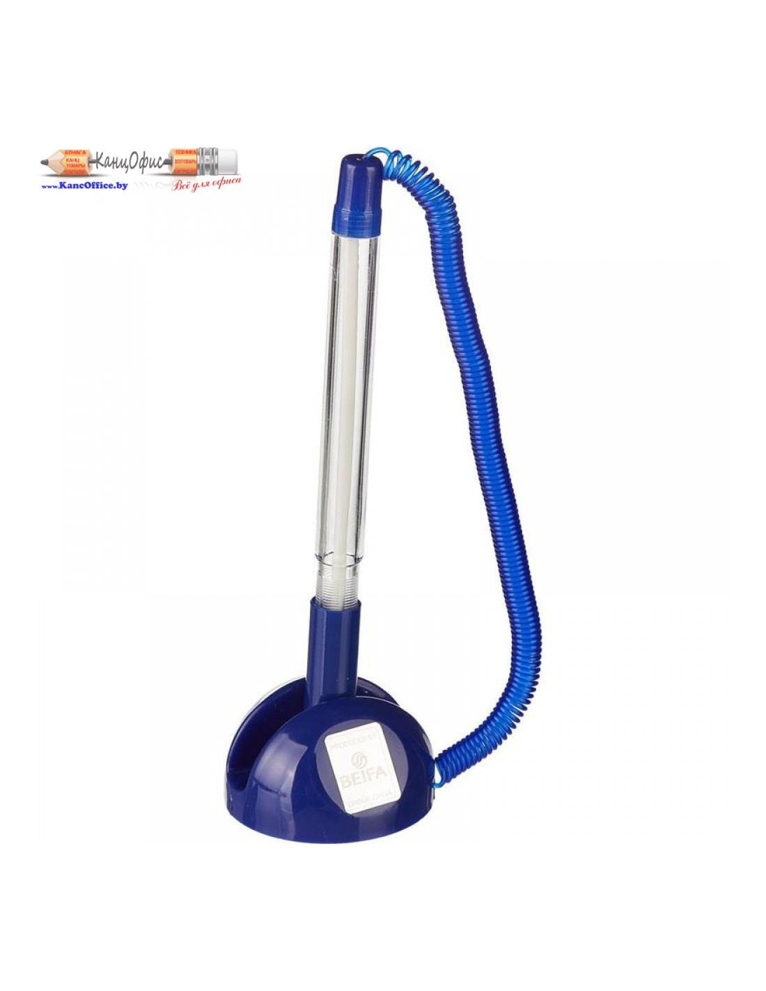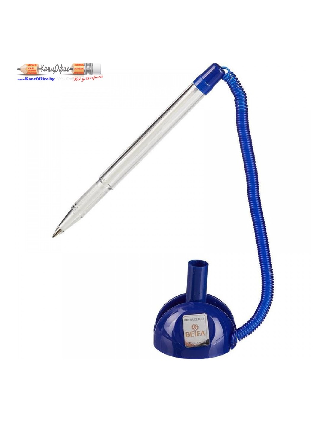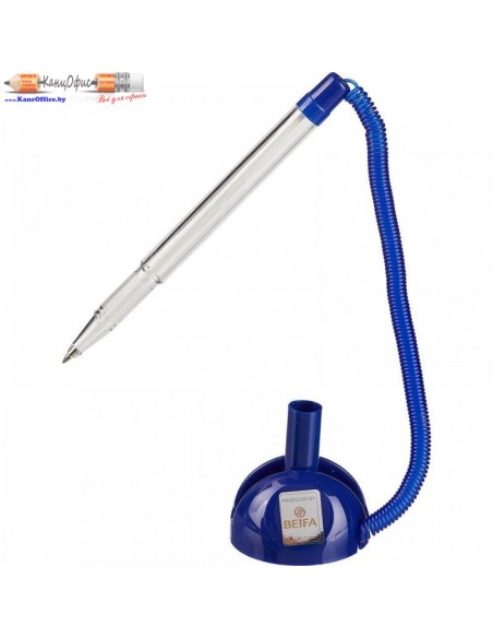 Шариковая ручка Beifa в подставке с синим цветом чернил. Модель представлена в корпусе прозрачного цвета с деталями синего цвета, выполненном из пластика. Изделие прикреплено к подставке с помощью резинового шнура-пружины. Длина пружины ручки в ненатянутом состоянии 14 см, в натянутом — 133 см. Благодаря липкому слою на основании подставка может быть жестко зафиксирована практически на любой ровной поверхности. Диаметр подставки — 45 мм, высота — 27 мм.
